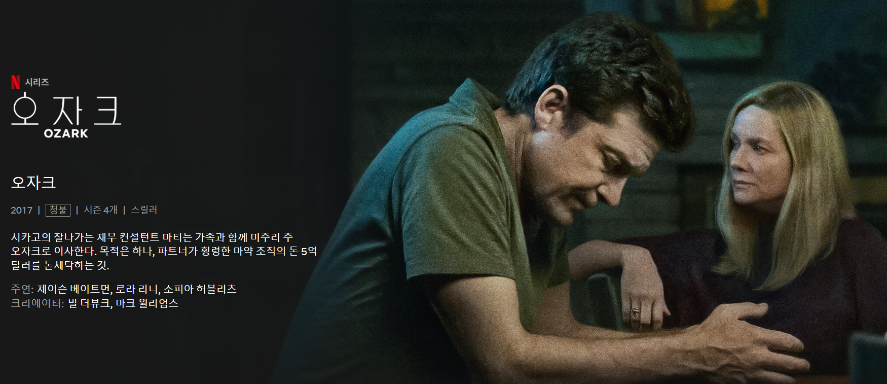 넷플릭스 오리지널 시리즈 '오자크(Ozark)'는 시카고의 평범한 재무 컨설턴트 마티 버드(Marty Byrde)가 거대 멕시코 마약 카르텔의 돈세탁에 연루되면서 벌어지는 일련의 사건들을 그린 범죄 스릴러 드라마입니다.